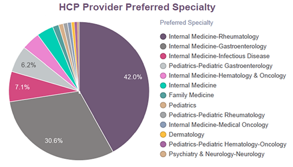 Using PurpleLab’s HealthNexus Provider Experience reporting, we looked at provider specialty related to a specific biologic reference, Remicade, and providers’ history of prescribing biosimilars of this drug. Among the various specialties that prescribed Remicade and its biosimilars (as shown in Figure 2), providers who had more experience prescribing Remicade were more likely to prescribe biosimilars Renflexis, Inflectra, and Avsola (not shown).