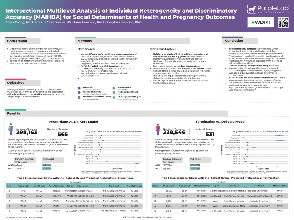 At ISPOR 2025 in Montreal, PurpleLab presented a research poster titled “Intersectional Multilevel Analysis of Individual Heterogeneity and Discriminatory Accuracy (MAIHDA) for Social Determinants of Health and Pregnancy Outcomes.”