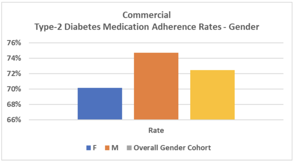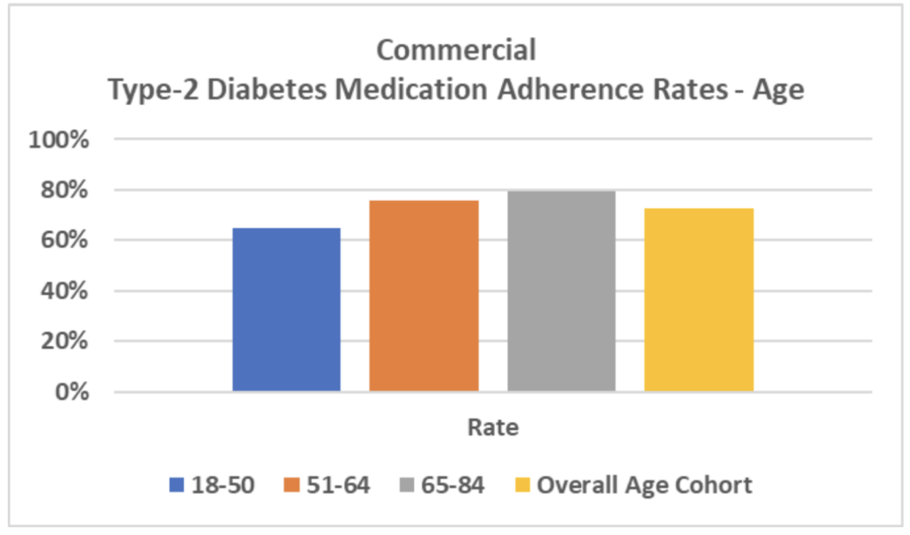 Additionally, using a PQA composite measure that assesses the adherence rates for diabetes, hypertension, and cholesterol medications, PurpleLab™ used our HealthNexus™ platform to examine adherence rates across all lines of business using open and closed claims.