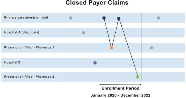 To create the most complete member profile, a plan must have access to data beyond its own claims. Adding robust open claims data, which provide information from a longer timeframe of the patient across multiple data sources and healthcare settings, enhances a plan’s understanding of its members. These illustrations[3] from the Journal of Health Economics Outcomes Research (JHEOR) show the difference between open and closed claims.